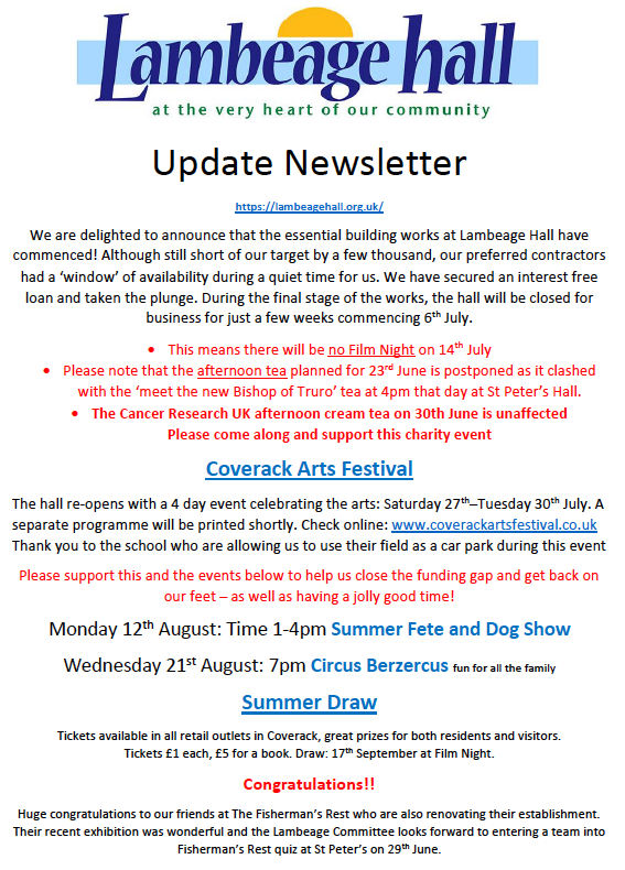 Coverack Lambeage Hall Update & Coverack Arts Festival Posted on 26th Jun 2019 by coverackvillage Reading time less than 1 minute Like Loading... Related