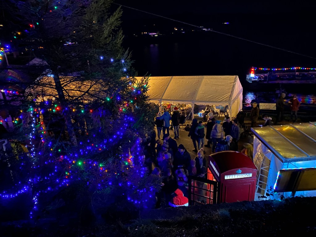 Hugh Richards, Chairman of the Christmas Tree Committee, thanked all those who attended and those who work so hard in the village to put on such an impressive display of lights. And particular thanks to the local businesses of The Lifeboat House, The Paris, and The Bay Hotel for their continued support with fundraising. After the Tree Lights were on, Father Christmas arrived, wishing everyone a Happy Christmas, and giving a present to every child.